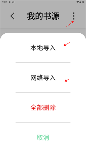 2、然后系统会自带部分的书源,如果觉得这些不够的话可以点击右上角,里面支持本地导入和网络导入。