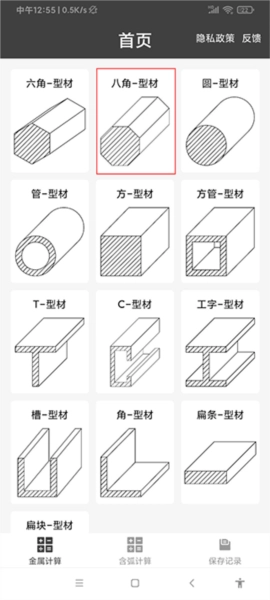 1、首先打开软件,在首页可以看到各种型材能够计算,先随便选择一个计算,“八角-型材”