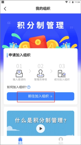 1、新用户注册并登录群艺积分制账号之后,选择首页当中的“前往加入组织”。