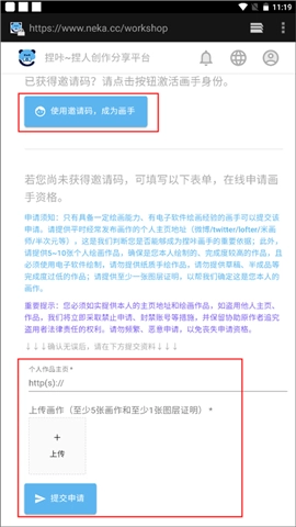 3、若你拥有邀请码,可直接点击“使用邀请码,成为画手”;要是没有邀请码,就在页面最下方上传自己的作品主页及画作。完成后点击提交申请,待系统审核通过,便可成为画手。