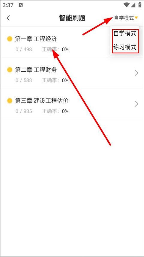 3、打开刷题页面,用户需要选择刷日章节并设置刷题模式,点击第一章开始刷题;
