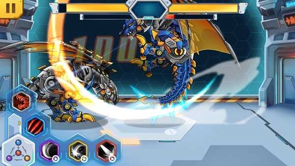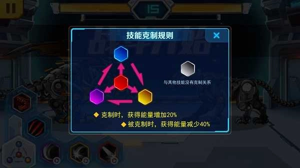 2、在机甲兽的正下方是技能系统,不同技能分别标以不同颜色,这是因为技能之间会相互作用,存在克制关系,利用好技能属性相互克制,轻松战胜对手,即便战力不及对方也能轻松取胜。