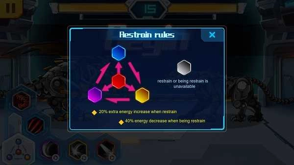 不论那种模式,其战斗方法都是一样的,优先能量充满的机甲将释放技能造成伤害,回合制的对决模式,看似非常简单,实则具有超强难度,不同的技能存在一定的克制关系,想要赢取每场胜利的关键所在,除了机甲的强力属性意外,掌握技能克制方才能赢得战斗。
