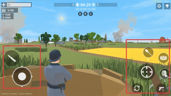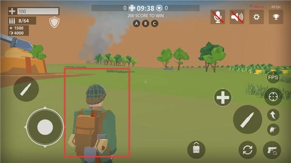 2、匹配进入战场,左侧虚拟摇杆控制角色移动、转向,右侧按键切换武器、射击,利用地形草丛、掩体隐蔽。
