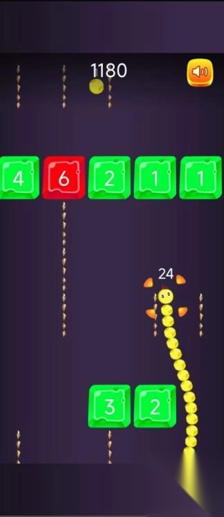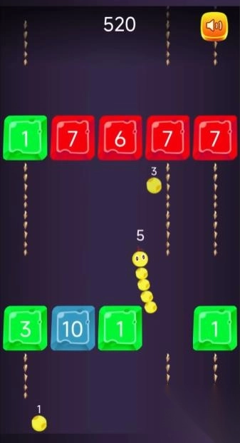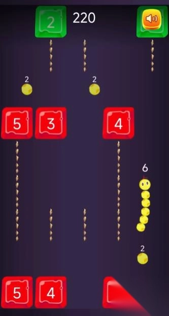 你将操控一条灵活的小蛇,不断吞噬屏幕上的圆点来增长身体长度,同时精准地撞击挡在前方的数字方块。每一个方块上都有代表“硬度”的数字,数字越高,越难击碎,而每一次撞击都会消耗你身体的一段长度。如果你没有足够的长度,就会被挡住甚至直接“Game Over”!你必须在极短的时间内做出判断,是选择绕开高数值砖块,还是冲击低数值方块从中突破?地图上也随机出现增益道具和奖励点数,为你带来更多的战术变化和挑战空间。