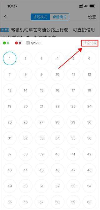2、若想在上述题库中重新答题,点击底部的“小方格”图标,接着在弹出界面的顶部右上角点击“清空记录”,即可重新作答。