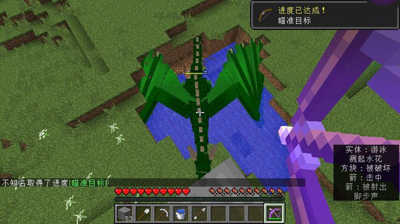 2、火龙打法和冰龙方法差不多,但是不能用岩浆了,至少准备2组箭,水桶还是要的(方便快速下柱子,当然你要回收石块也可以,但是如果你本来就是石块太多的话就留在原地也没有任何问题),或者像下图一样,想办法把火龙吸引到水塘里面,然后弓箭伺候(火龙在水里如入泥潭)。然后输出即可。