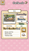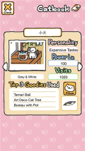 在主界面里你可以观察猫咪不同的姿态,按照自己的喜好在规定位置摆放道具。长按某一只猫可以切换到拍照模式,单点某一只猫就切换到这只猫的名片界面。观察了一阵子就可以把游戏关了或者后台彻底退出,等空闲的时候再打开看一看,会发现又来了新的猫咪(一直盯着屏幕是不会有新猫咪走着进来的)。猫咪后院的猫咪与你不会有直接互动,这也是这款游戏的独特之处。
