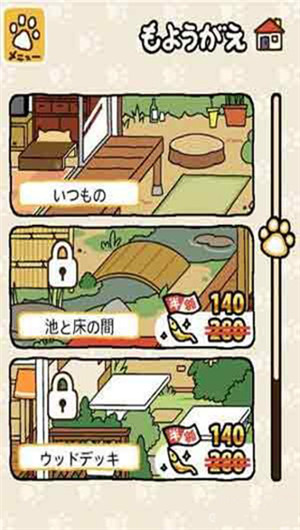 3、在你完成第一次扩建之后,玩家们依然可以继续收集鱼干继续扩建,扩建的方法和之前一样,当你点击商店的菜单的时候,会在菜单左下角出现类似于房子一样的标志,点进去后你就可以用收集的180金鱼干再次更换新的场景了。