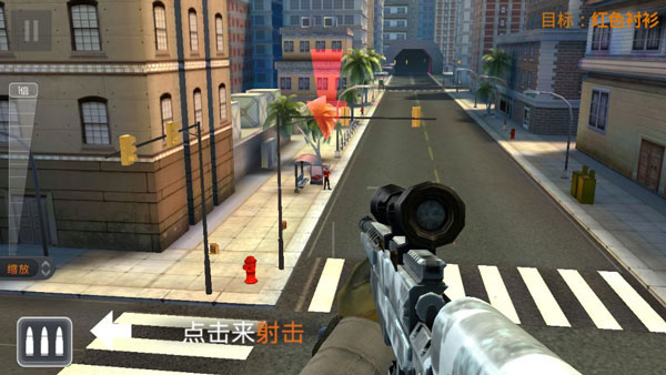 3、借助倍镜,调节角度击毙任务目标,从而完成闯关。需要注意的是,随着关卡逐步推进,难度会不断增大。
