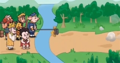 第八关,让猪八戒使用钉耙拉住对面的木桩,这样就能全部顺利通过,无需逐个过河。