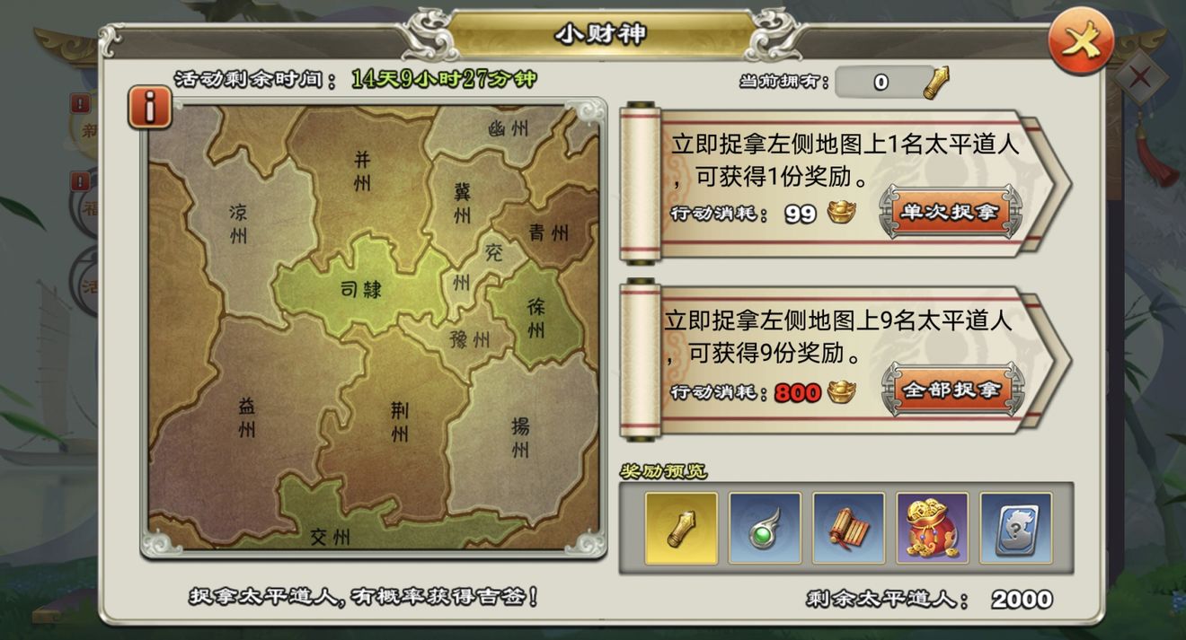 捉拿奖赏:吉签、三星武将卡、中金钱袋子、兵书、将魂(温馨提示:若要抽取,前4次为宜,后续抽取爆率或许会降低)