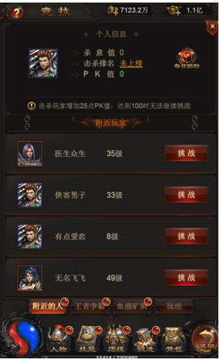 d. 在界面里,玩家能够查看自身竞技排名。通过挑战其他玩家,可获取杀意值,进而提升个人竞技排名。