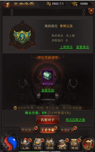 c. 每周日22:00,王者争霸进入休战阶段,在此期间,玩家无法进行匹配。每周日22:30,系统会对本周王者争霸的段位奖励进行结算。结算后的奖励将以邮件形式发放给玩家,同时,所有玩家的段位将被重置。下周一10:00,王者争霸重新开放挑战。