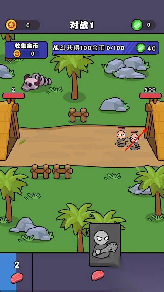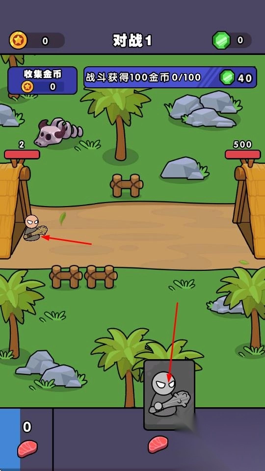 1、进入“对战1”关卡后,通过消耗食物来召唤兵种,将其部署到指定路径上,与敌方单位展开战斗并获取金币。