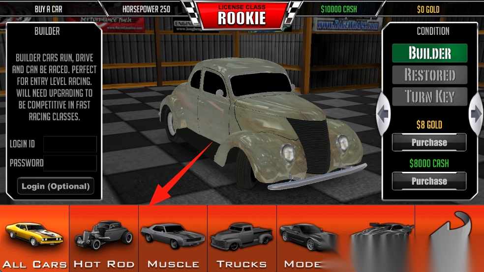 1、在购车界面挑选车型,可使用现金或金币完成购买,以此为赛车参与竞速赛事做好准备。