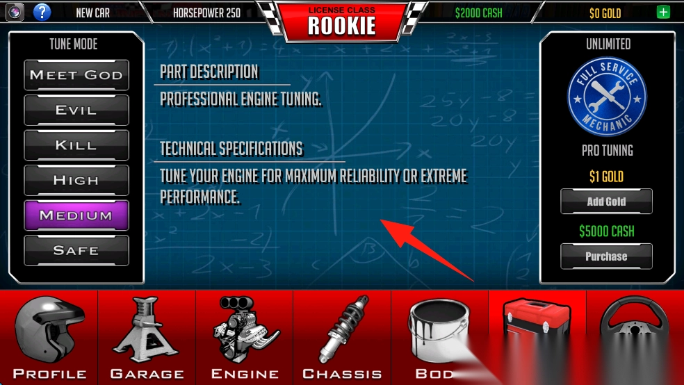 3、在引擎调校界面,选调校模式,依据需求调整,优化赛车动力表现。