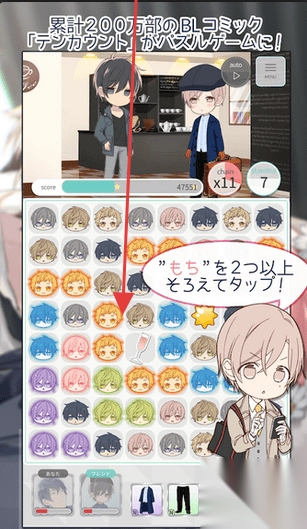 1、消除玩法:在消除界面,凑齐2个以上相同“もち”角色图标消除,连击(×11)获取高分,解锁剧情、道具奖励。