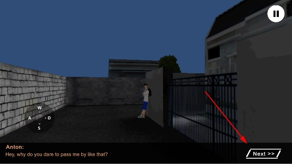 3、当角色移动到指定区域后会触发剧情,点击右下角的“next”按钮即可跳过剧情。