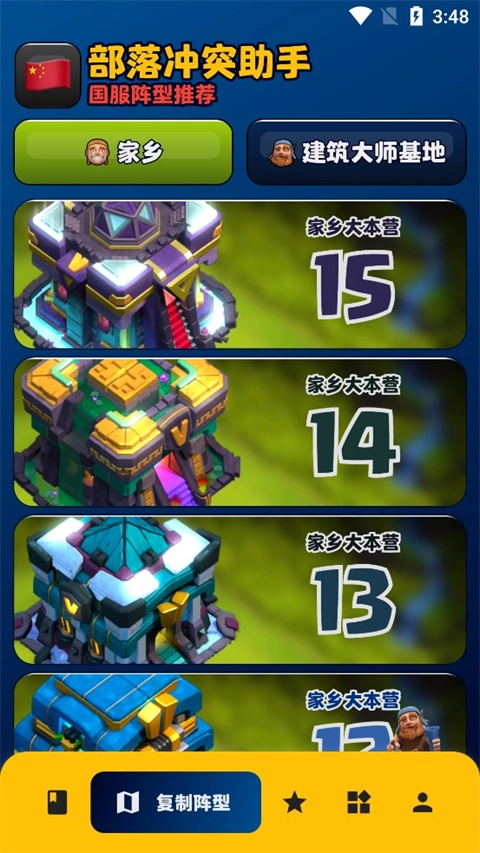 1、首选打开coc部落冲突助手,在首页点击下方复制阵型,下图箭头方向图标;