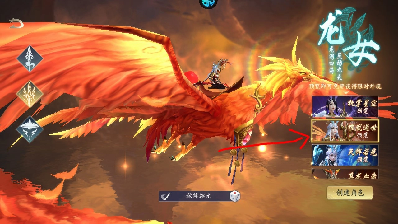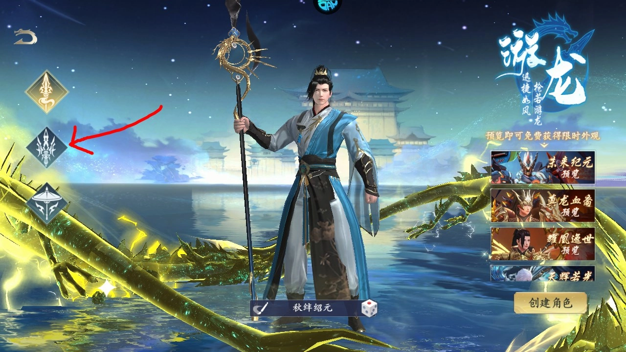2、进入游戏后有三个职业可供选择,第一个职业“游龙”对应的是男性角色,若想查看其他角色,可点击左侧按钮进行切换。