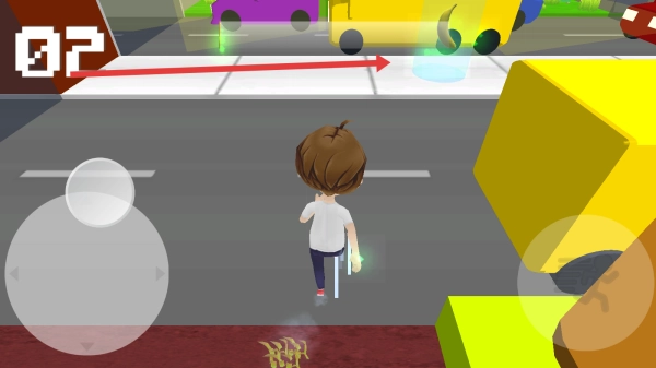 进入街道场景后,按照箭头指示,控制角色穿过车道空隙收集道具,要留意躲避车辆,确保安全行进。