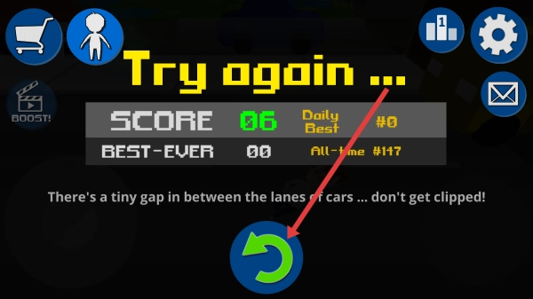3、要是挑战失败后出现Try-again界面,你可以点击中间那个绿色的循环箭头按钮,重新开启游戏挑战。