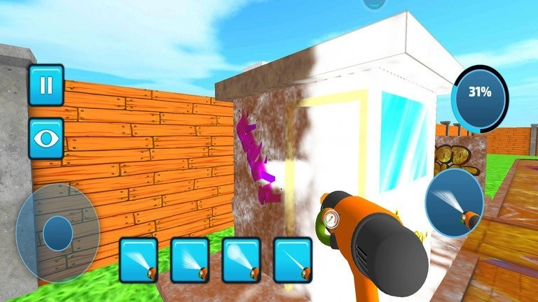1、玩家通过触屏拖动控制喷嘴瞄准角度,并调节水压强度,对目标区域进行全面清洗;