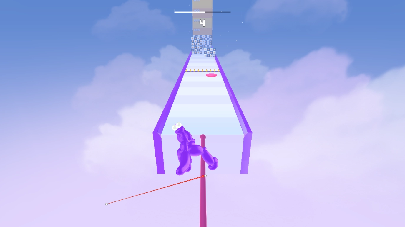3、当你带着体型足够大的气球人到达关卡终点后,气球人会被圆环束缚住并向上攀升。在上升的过程中,要留意躲避出现在各个位置的刺球,攀升的高度越高,获得的分数就会越多。