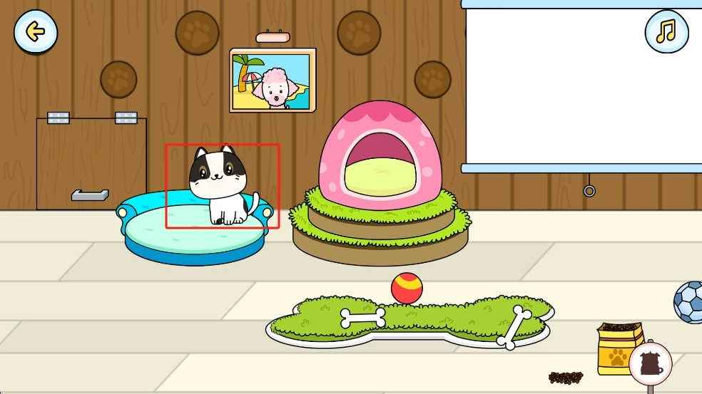 2、点击室内蓝色圆垫上的猫咪,触发互动行为,可探索宠物状态或解锁后续场景内容,留意周边玩具设施。
