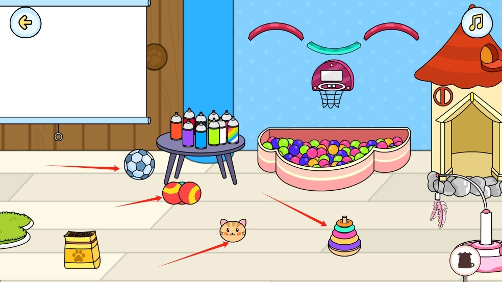 3、按照指引,对场景里箭头所指的足球、双色球、猫咪头像和叠叠乐进行相应的互动或归位操作,以此完成物品匹配的任务。