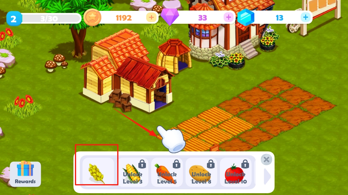 3、在农场种植界面,下方显示可种植作物,点击已解锁的作物图标,比如小麦,将其种植到农田空地,通过选择作物点击种植,提升农场生产多样性,开启种植新流程。