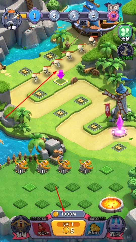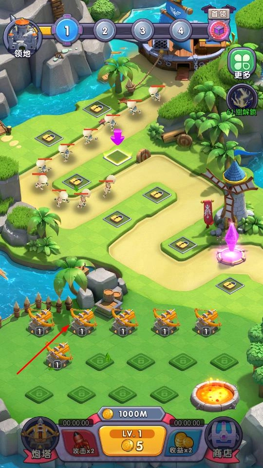 1、点击紫色箭头所指的位置来布置防御建筑,借助初始资源搭建基础防线,以此阻拦敌人的推进。