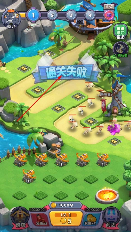 3、若敌人突破防线致通关失败,可重新调整炮塔布局、升级建筑,再次挑战,守护领地安全。