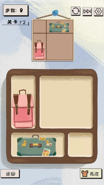 1、每一个关卡都会设定一个目标图案,玩家需要把杂乱无章的杂货铺布局调整成与目标图案一致的状态。