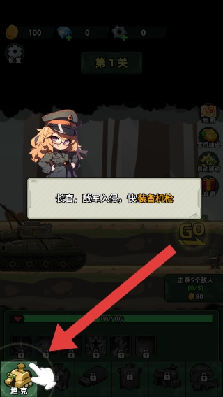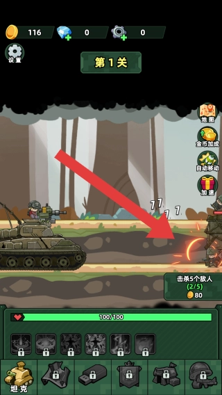 1、功能包含金币加成、自动布防等,同时提供坦克相关的操作提示,设定的目标为击杀5个敌人即可获得80金币奖励。