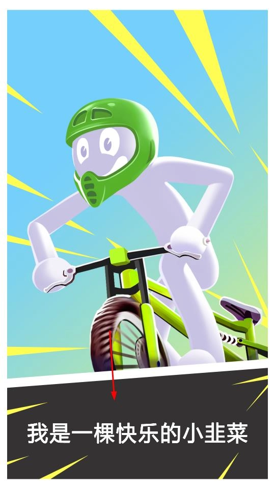 1、进入游戏后操控头戴绿色头盔的角色跨上自行车,带着“我是一棵快乐的小韭菜”的趣味标识,开启一段骑行冒险,从独特的场景中正式出发。