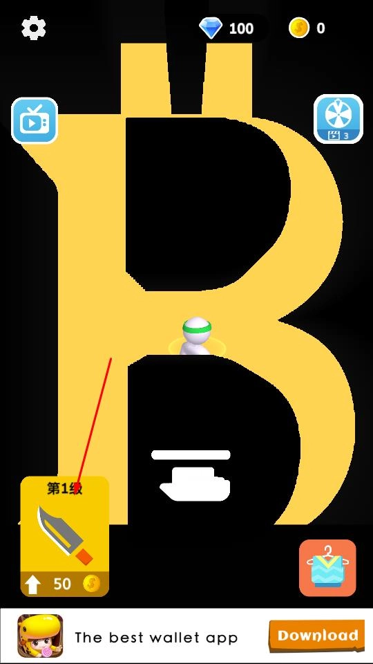 2、进入形似比特币造型的关卡地图,角色处于1级初始状态,点击武器图标即可消耗资源提升战力,为闯关节奏提前做好准备。