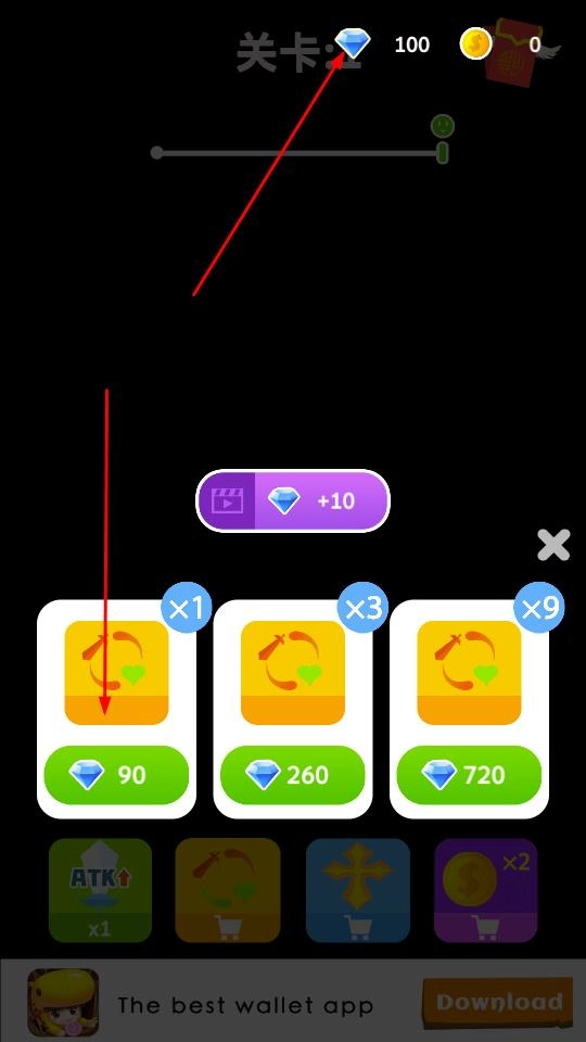 3、闯关时留意上方的钻石等资源,根据需求点击钻石+10的视频按钮,或者消耗相应钻石购买90钻、260钻、720钻档位的道具,帮助角色顺利通关。