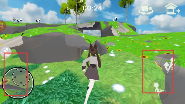 2、借助红色方框里的虚拟按钮来操控角色进行移动与跳跃,避开怪物的追赶,达成游戏任务,从而获得游戏分数和奖励。