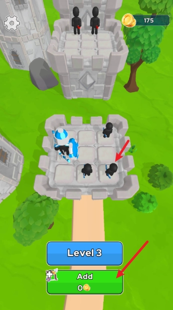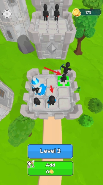 3、这里有一座弓箭塔可供你使用。把相同类型的火柴人弓箭手合并起来就能升级他们!你招募的弓箭手英雄等级越高,击败敌人的速度就会越快。