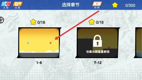 1、点击1-6章节的图标即可进入关卡选择界面,这些章节需要引导蓝球完成通关,完成后就能解锁7-12章节。