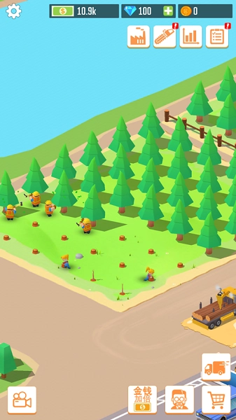 为了能够可以持续性地采伐树木,您需要雇佣植树工来种植森林!购买更多林地并将它们染成您心中的绿色吧!培养您的伐木工们,熟练的伐木工可以更加有效地协助您采伐原木。
