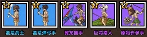 1、新手阵容卡队兵种组成:蛮荒战士、蛮荒弹弓手、翼龙捕手、巨龙猎人、原始长矛手