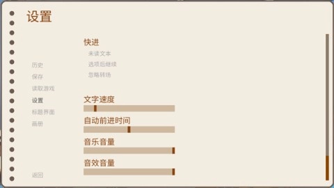 6、游戏设置中还能调整文字速度、音乐、音效等选项。
