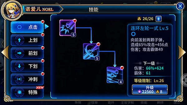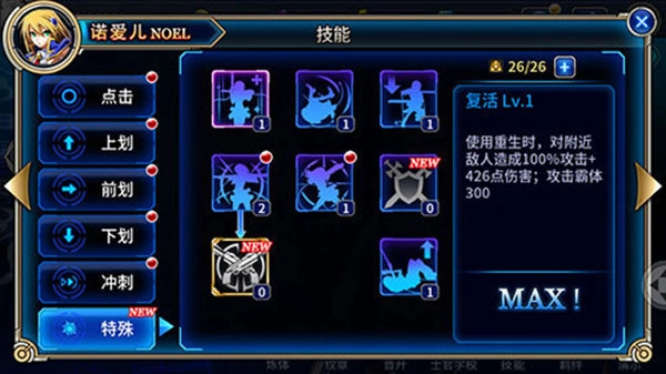 玩诺爱尔这个角色时,玩家除了“练体”属性外,其他属性最好都点满。诺爱尔的羁绊效果是:白面增加攻击,松鼠增加血量,男主则是攻击和血量各加一半。考虑到前期技能点比较紧张,而羁绊加成是和对应人物的属性挂钩的,所以羁绊等级得跟上,装备强化也不能落下,纹章也要升到对应属性(前期资源尤其金币会很紧缺)。比如白面能提升诺爱尔的攻击,那纹章就点魔素(长按可以自动升级,经验瓶的使用也是同理);装备方面,紫装阶段就可以开始强化了,后续直接把强化过的紫装喂给橙装,强化等级是能完美继承的。不过强化过程中金币消耗很大,所以建议前期如果条件允许,VIP礼包里的金币一定要买哦。