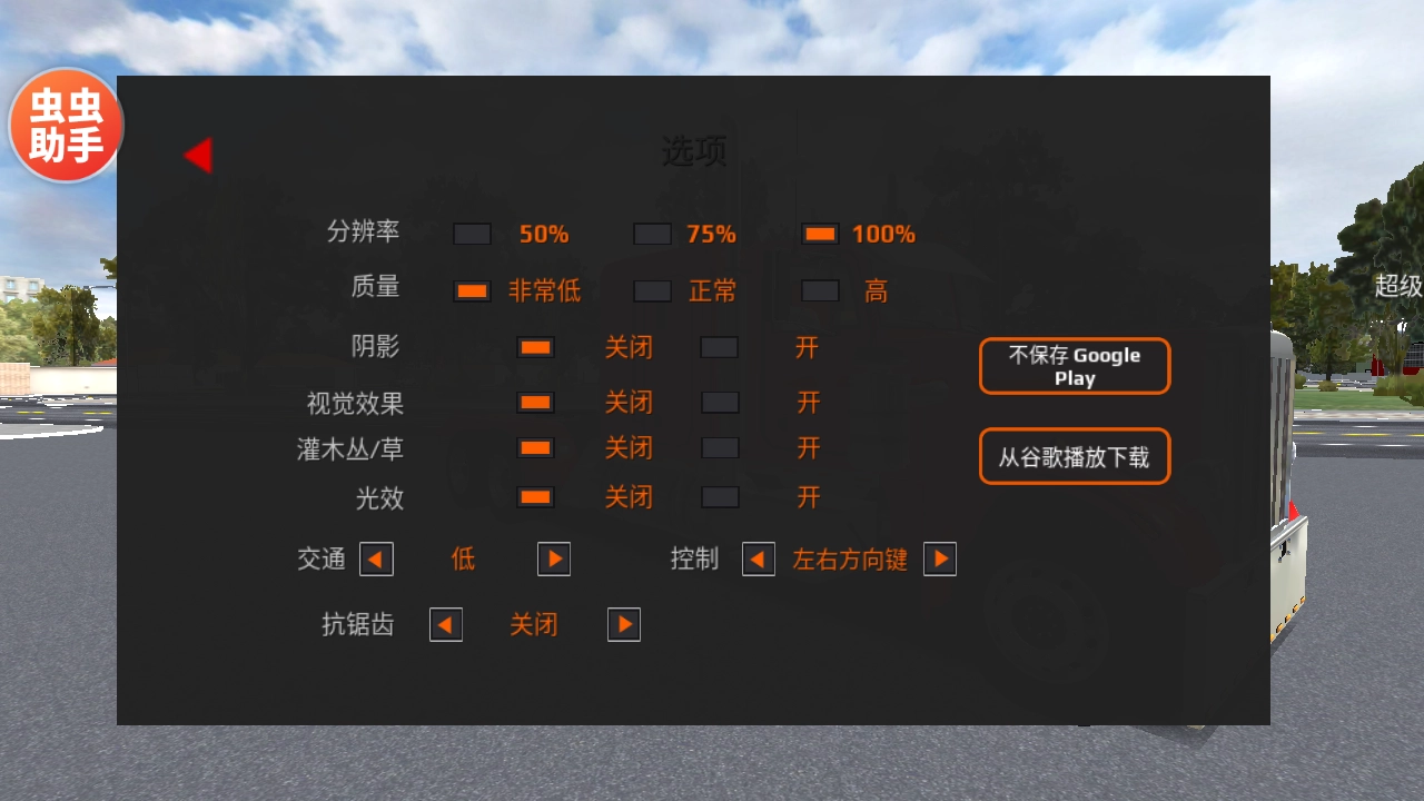 1、打开世界卡车驾驶模拟器游戏,进入游戏既是全汉化版本,可以畅快游玩,免受语言不通的困扰,在左上角调节相关的设置。
