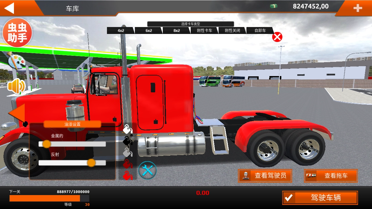 3、在车库内你可以设置车辆的喷漆,选择司机和拖车,然后你就可以驾驶这辆汽车上路了。