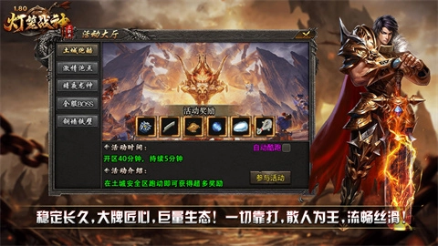 灯笼战神180作为经典的战神版本传奇,在游戏里掉落的物品能自动拾取、自动回收,还有海量材料与金币等你获取。它复刻了经典的激情战神玩法,致力于打造生态人气大服,只要投入时间就能追逐所有梦想,激情永不停歇。
