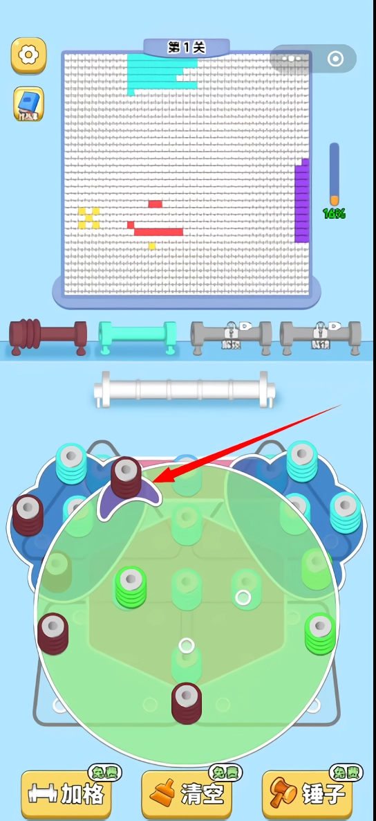 2、填充谜题:当柱子被毛线彻底包裹后,系统会自动把毛线填充至上方的谜题框架内,在游戏过程中,填充进度会实时呈现在屏幕上方。